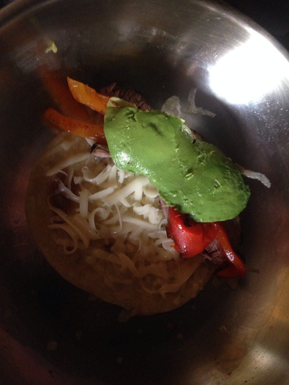 Our go-to to lunch (i.e., what we generally eat when we eat in): steak or chicken tacos with grilled red or poblano pepper, avocado, and Manchego cheese on a corn tortilla