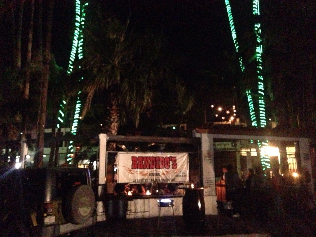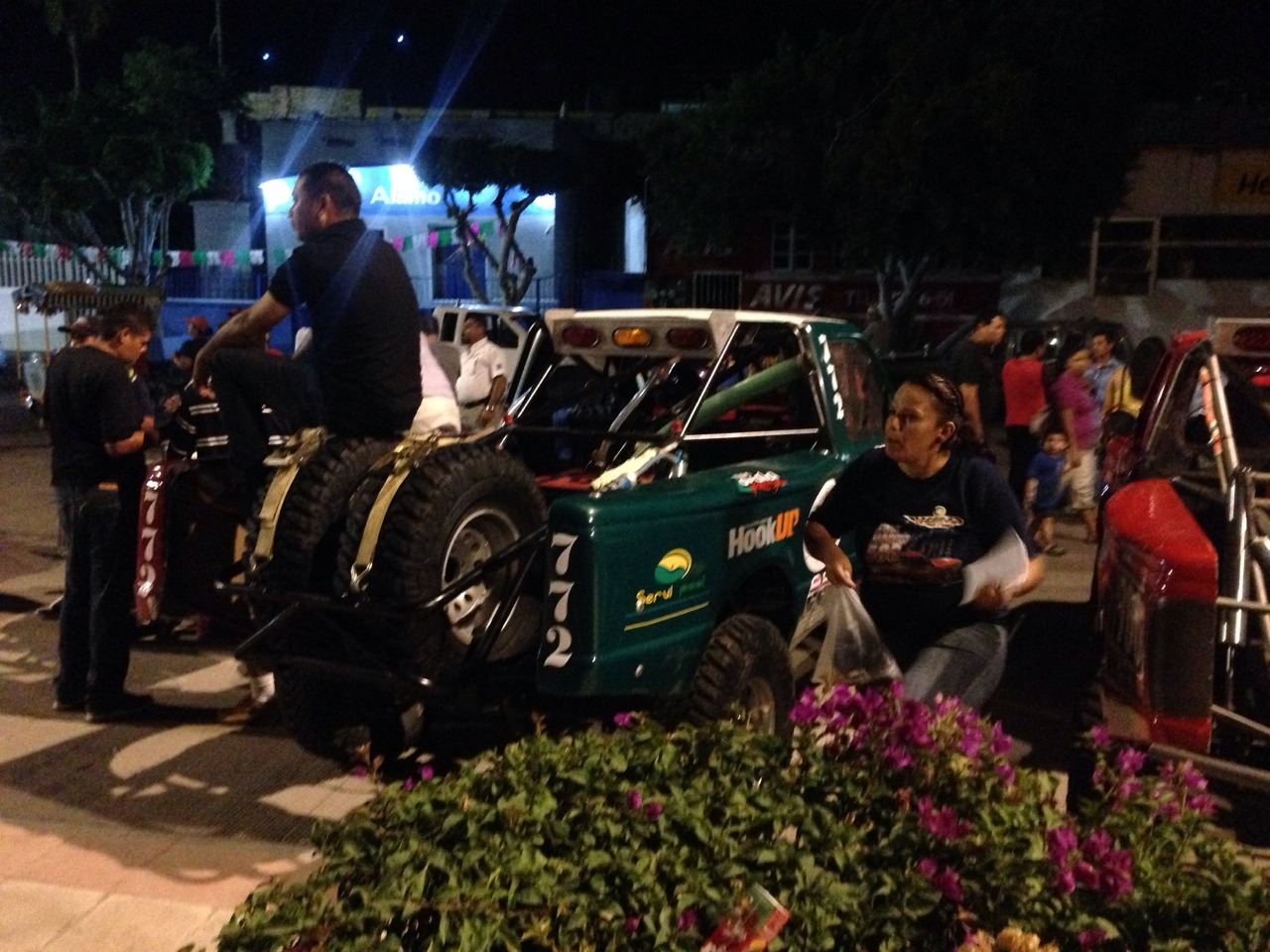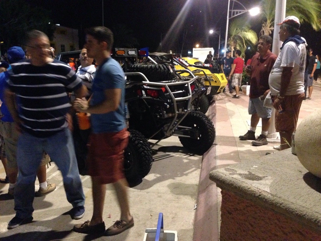 Dinner at Bandidos and Baja Grand Prix street scene. Bandidos is a burger joint, La Paz’s version of American Graffiti with outdoor tables, a grill made out of the engine and hood of an old Chevy, and American blues and rock music from the 1950s-1980s (mostly the early 1960s). Charlie’s Mexican classmates swear it’s the best place for burgers, so of course that’s what I had to get. Mistake. Their burgers are topped with plasticized American cheese – plastic wrapping still on? – which mades them close to inedible but not too close when you’re really hungry. After dinner we walked along the Malecón where hopped-up dune buggies were displaced, apparently in advance of the Baja Grand Prix.