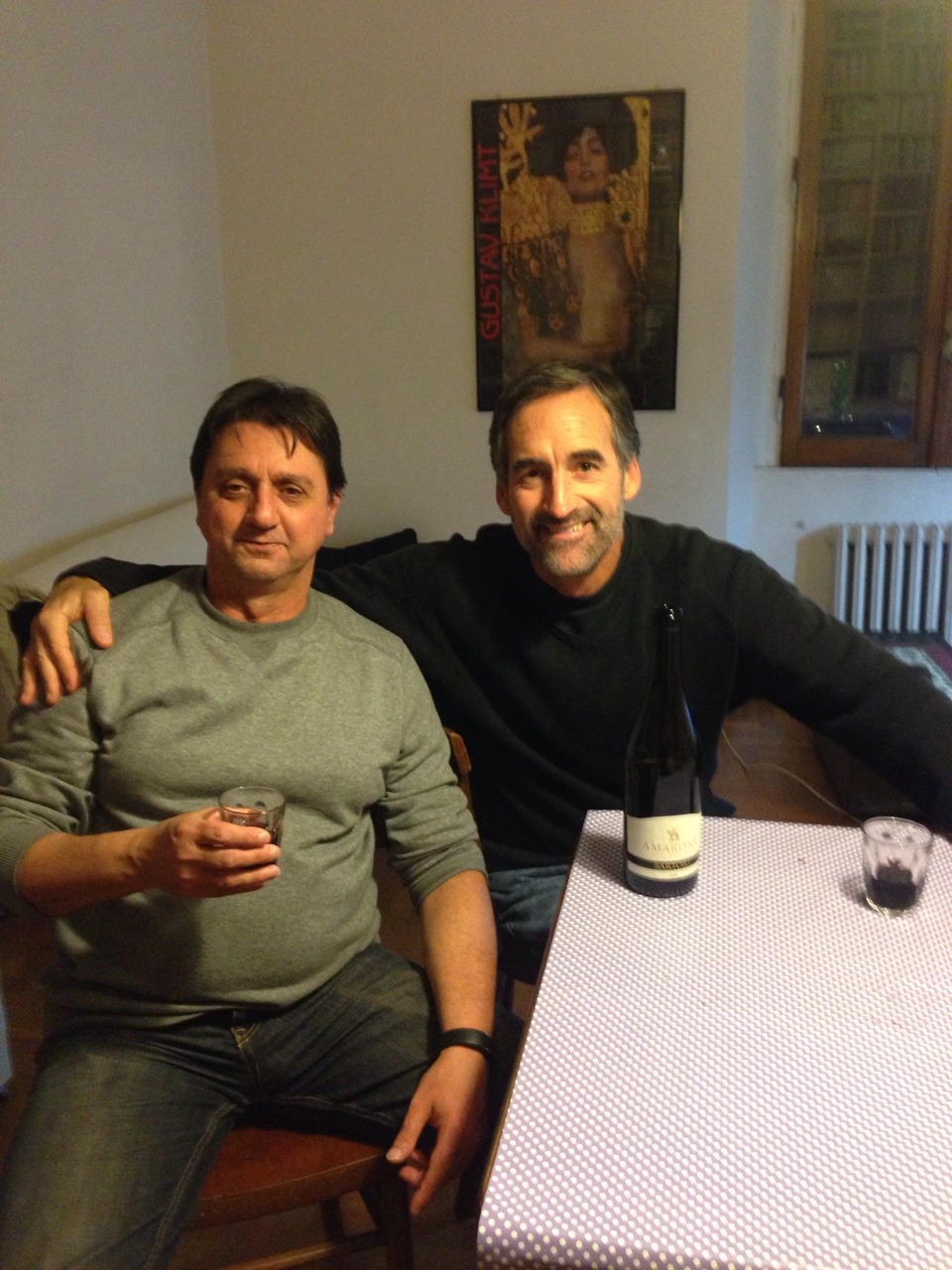 Sharing a lovely red wine with old friend Marcello, before dinner with him at Da Bucatino. He brought it, a 2011 Sartori Amarone della Valpolicella, along with castagnole.