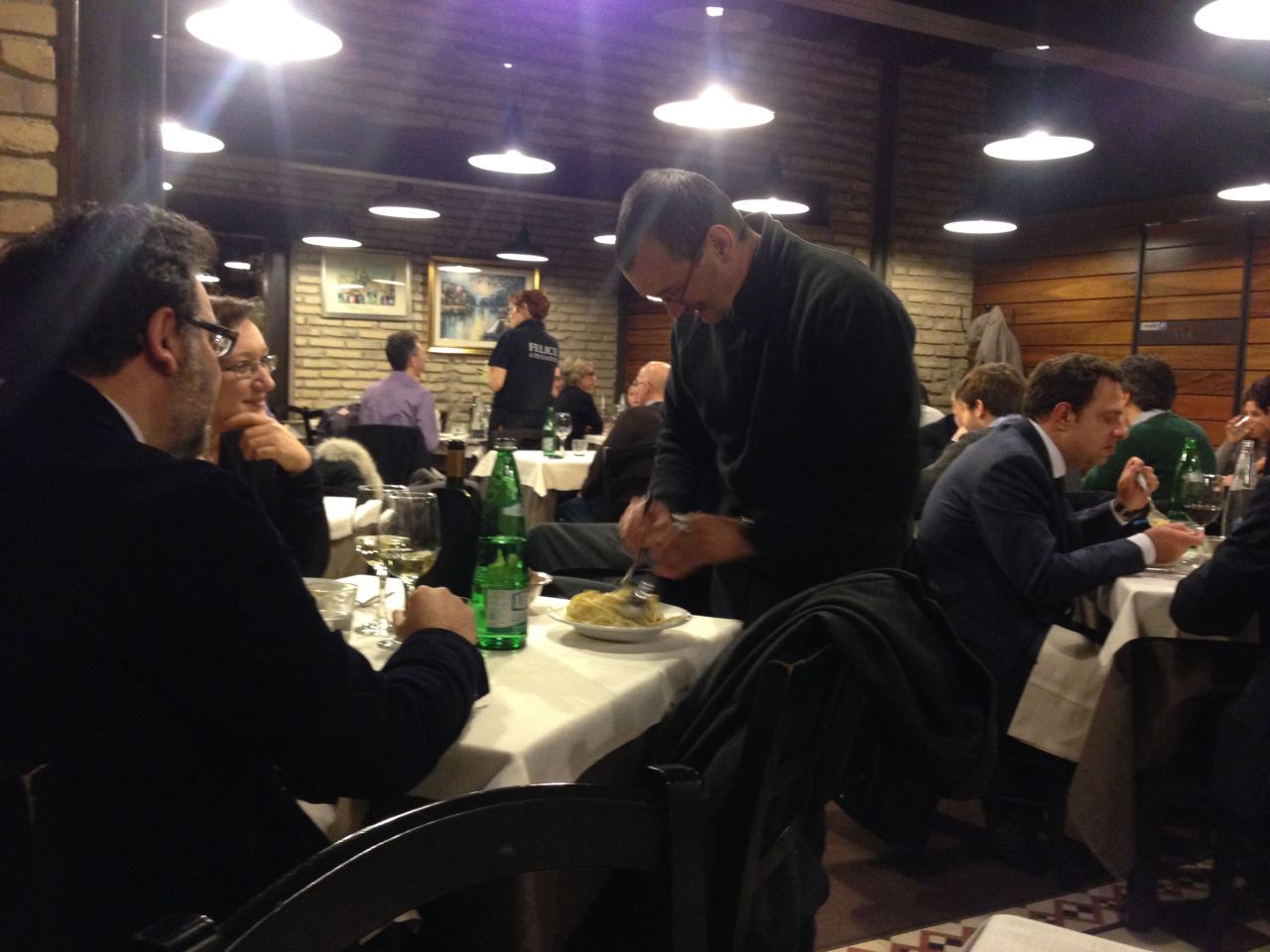 Celebrating my 59th birthday at Felice with Becky, on her last night in Rome. Lovely dinner of puntarelle, carcoifi alla Romana, pasta cacio e pepe, braciola. Prosecco to start, amaro to finish, Syrah in between. Alex the Cuban-Italian-American adding a vest to the experience. Life doesn’t get any better.